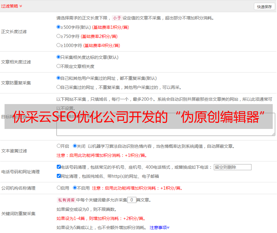 总之,优采云SEO优化公司开发的“伪原创编辑器”是一个很不错的工具,既能够快速生成新闻内容,也能够帮助用户生成SEO优化内容。如果你想要在互联网上制作出专业、有说服力的新闻内容,那么就不要错过了“优采云SEO优化”公司开发的“伪原创编辑器”!想要下载试用版本就可以前往它们官方网站www.ucaiyun.com 上进行下载了。