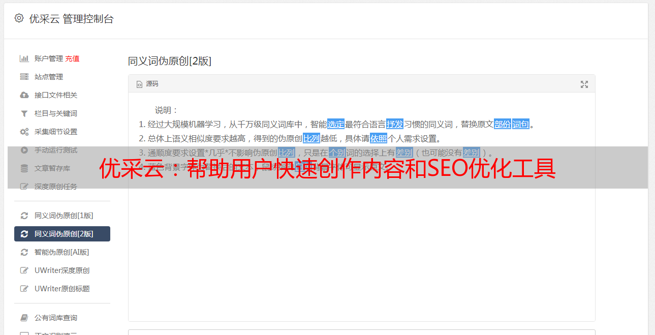 总之,优采云既方便用户快速地创作出高质量的内容,也能帮助用户进行SEO优化和平台合并后期效果监测。此外,它还具有易学易用特点,是一款很好的帮助用户快速创作内容和SEO优化工具。如想要了解详情情况,就来官网www.ucaiyun.com 吧!