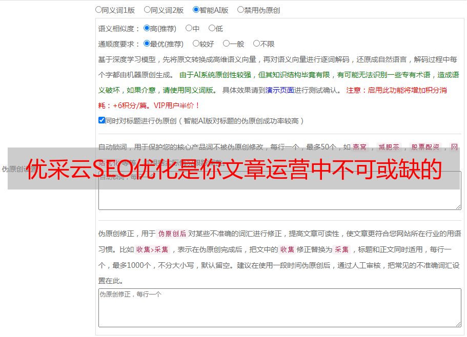 优采云SEO优化是一款高效的在线伪原创工具,它能够有效地帮助用户快速生成原创内容,从而满足文章运营的需要。它通过把文章中的语句和段落重新排序、修改语法、替换词语、增加关键词以及其他修改手段来使文章看起来像是原创的,而实际上却是根据原文进行修改后得到的结果。
