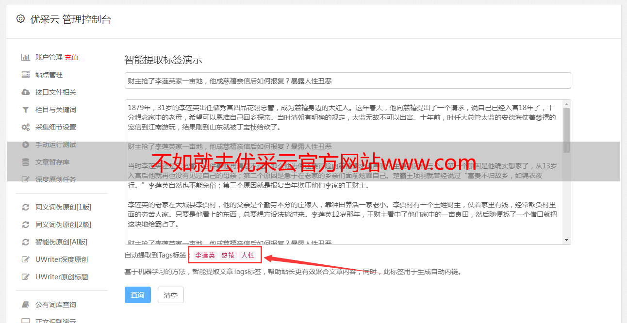 此外,优采云还为用户提供了易于使用的界面和强大的功能。它不仅能够快速有效地实现数据采集,而且还可以对所获得的信息进行分类、压缩、去重、去噪声和校验等处理。此外,优采云还能够帮助用户快速生成SEO优化内容,使得用户所获得的内容不但准确及时,而且还能有效地带来流量。