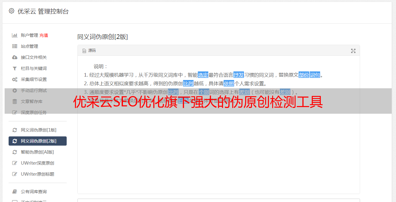 总之,优采云SEO优化旗下强大的伪原创检测工具可以帮助广大网站和APP快速、准确地发现存在于文章中的重复性内容和不合法内容;此外,使用该工具也能够避免不必要的版权风险。如想了解更多信息,欢迎访问 www.ucaiyun.com 了解详情。