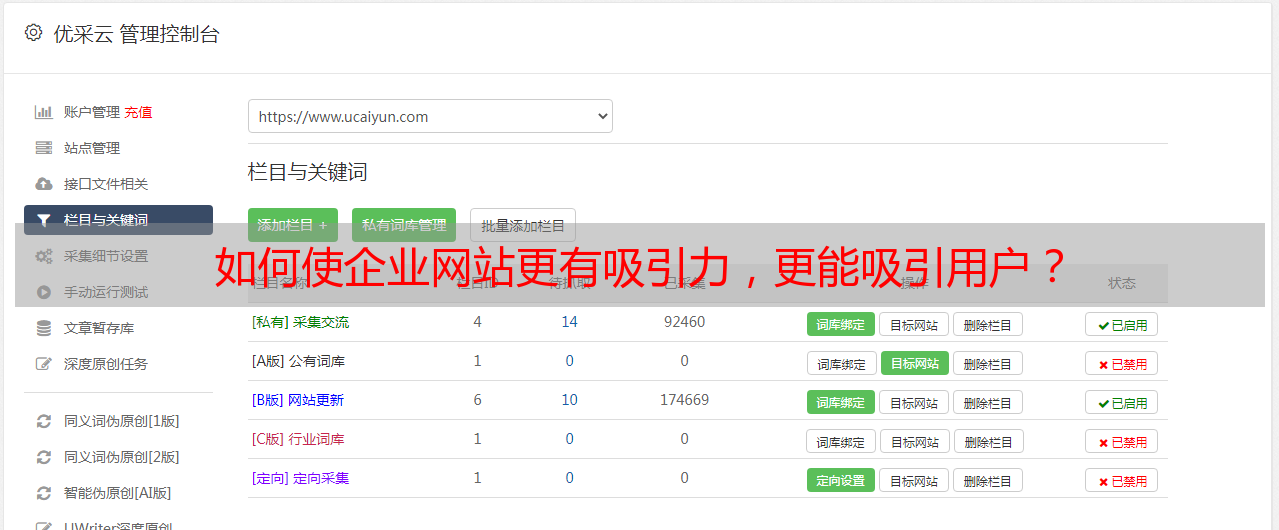 但是,想要写出吸引人眼球的原创文章并不容易。因此,很多企业都会选择像优采云这样的软件来帮助他们实现目标。优采云是一款SEO优化工具,旨在帮助用户根据关键词快速生成文章。它可以帮助用户节省大量时间和精力,同时也能保证文章内容的高质量。此外,优采云还可以通过一些功能帮助用户提升SEO效果。因此,不少企业都选择使用它来帮助他们快速生成高质量的原创文章。