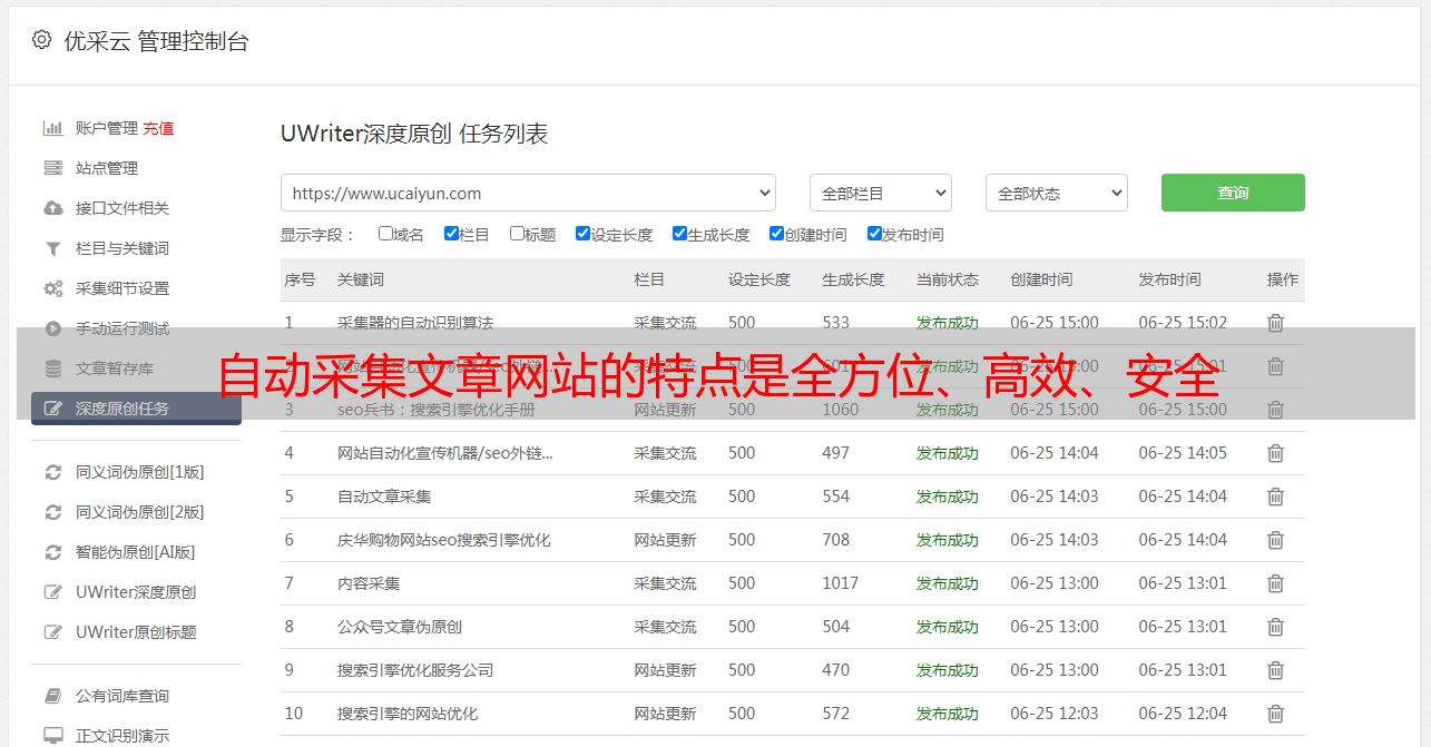 总之,优采云是一款卓越的自动采集文章网站。它具有SEO优化、实时监测、用户行为分析、交互性强、信息准确性高、信息及时性好、将信息及时分享到各大社交平台上等特性。如有兴趣想尝试使用此工具来帮助企业进行信息传播,可以前往官方网址www.ucaiyun.com 进行注册使用。