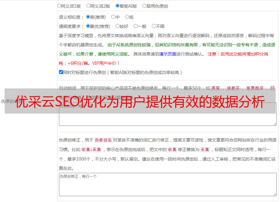 优采云SEO优化是一个功能强大而易用的工具,不但能够帮助用户快速、有效地获取各大平台上的信息,而且还具备一套强大的分析功能,能够帮助用户对所得到的内容进行详尽的分析,从而帮助用户对相关内容进行有效利用。如想了解详情,请前往www.ucaiyun.com 浏览相关信息。