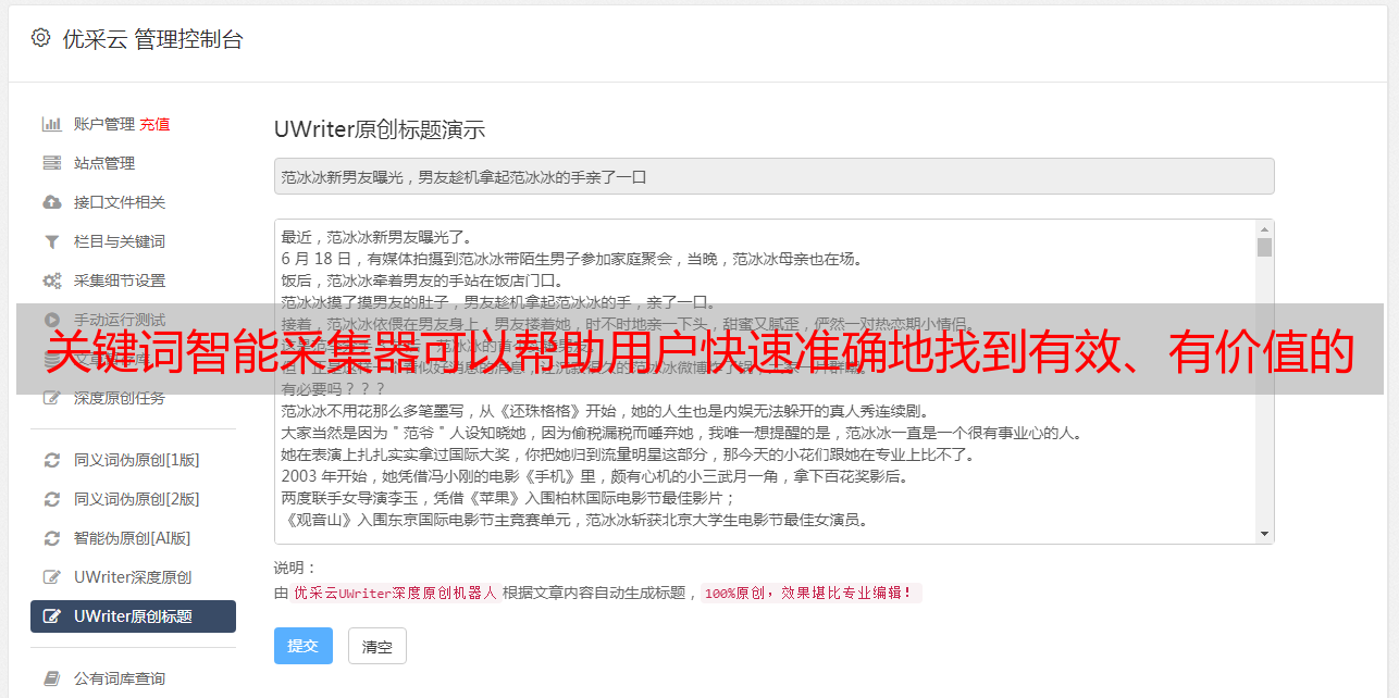 优采云是一款优秀的关键词智能采集器,它可以快速准确地从网上采集到有效、有价值的关键词。它可以根据用户输入的关键词范围,自动扫描网页内容,并且可以过滤无效、无价值的内容。同时,优采云还可以根据用户输入的关键词,进行数据分析,对采集到的关键词进行分类,如根据热度、权重、流行等多个方面对关键词进行分类。