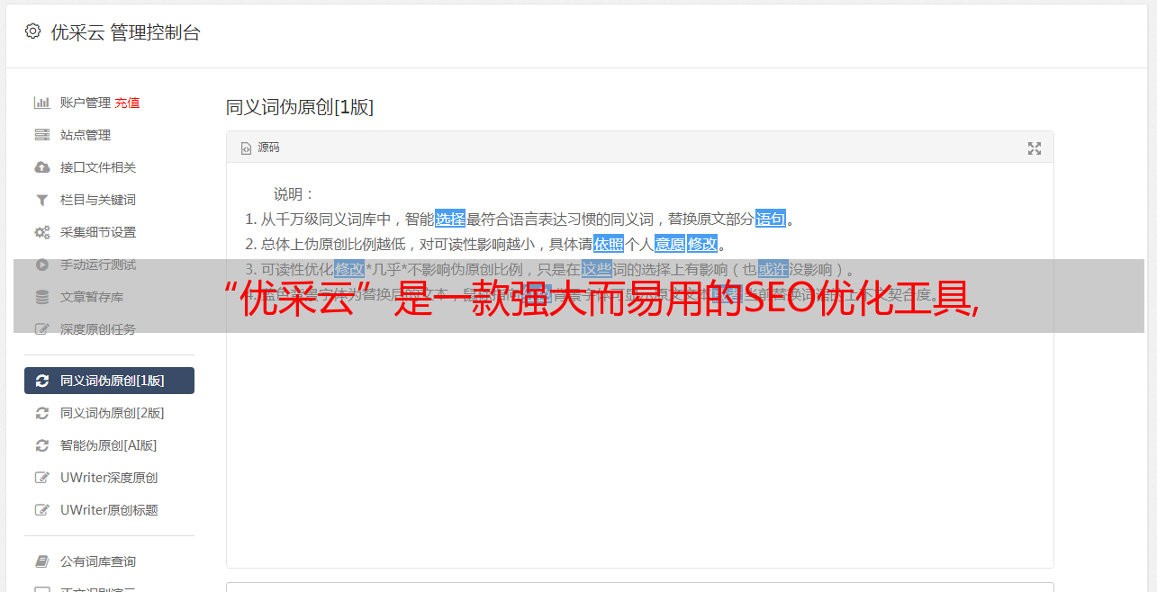 “优采云”是一款针对SEO 优化而开发的工具软件,具有强大的功能和性能。该软件支持多种文字处理功能,如文字修饰、重新构思、合规校验、图片处理等;此外,还集成了AI 技术,能够快速准确地对文字内容进行修饰和修改。使用者只需将原始文字内容复制并上传到“优采云”中就可以快速生成一批伪原创文章;而且该软件提供了专业的团队协作功能,可以帮助团队成员之间快速准确地进行协作工作,加快SEO 优化工作进度。