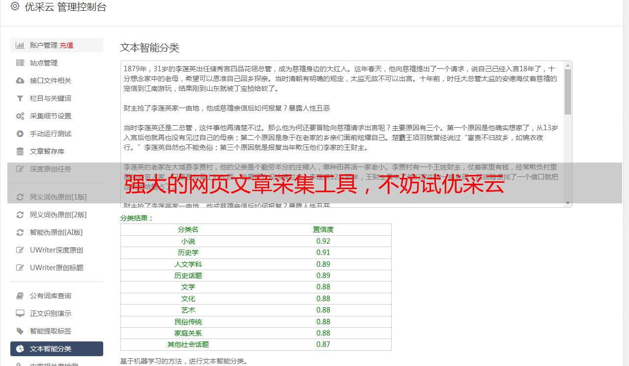 总而言之,优采云是一款强大的网页文章采集工具,它能够帮助用户快速、有效地获取所需的文章内容。它具有SEO优化功能,能够根据不同的关键词获取相关内容;而且,还能够根据用户的要求对内容进行分类和标注;此外,还可以追踪新闻来源和发布时间。如果你正在寻找一款好用的网页文章采集工具,不妨试试优采云。它的官网是www.ucaiyun.com :你可以前往详细了解这款工具的使用方法。