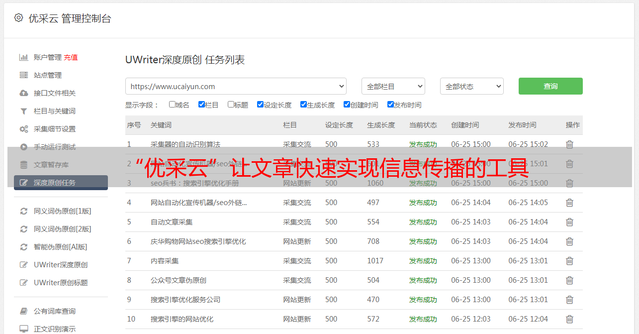 总之,随着时代的发展,使用自动采集发布文章来实现信息传播已成为不可或缺的一部分。而作为一款专业而先进的自动采集发布文章工具——“优采云”就是你最好的选择之一。它不仅能够快速地将内容发布到各大平台上,而且还能够对文章进行SEO优化,使得文章在各大平台上都能够显得很出彩。如想要详情了解“优采云”,可以浏览它的官方网站www.ucaiyun.com 。