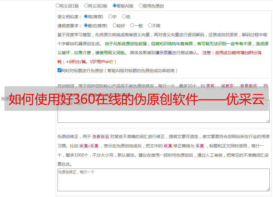 优采云 发布时间: 2023-02-05 15:45360在线伪原创:360在线软件是一款智能伪原创软件,可以帮助用户快速生成高质量原创文章。它集文章自动改写、关键词优化、图片处理等功能于一体,对于文章的原创性、SEO优化有强大的作用。