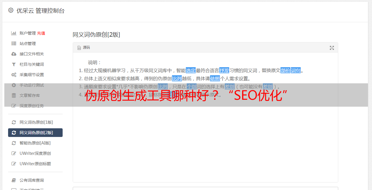优采云 发布时间: 2023-02-05 19:38近年来,随着互联网技术的不断发展,伪原创工具也在不断涌现。伪原创生成工具可以帮助用户快速生成伪原创内容,可以有效地降低文章写作所需要的时间和精力。因此,不少用户都想知道,伪原创生成工具哪种好呢?