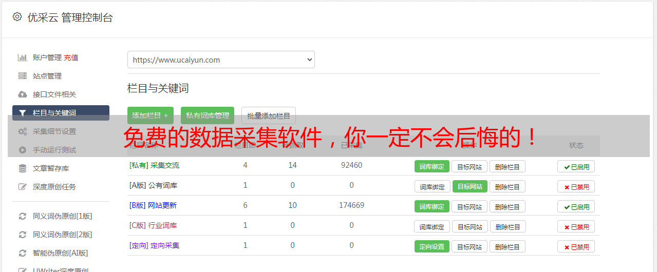 优采云就是一款免费的数据采集软件,它由优采互联网科技公司开发,旨在帮助用户快速、准确地采集各类数据。优采云的功能强大,可以实现多站点、多关键词、多平台、多样式的数据采集。它还具有SEO优化功能,可以帮助用户优化站内SEO,有效地提升站内搜索引擎权重。