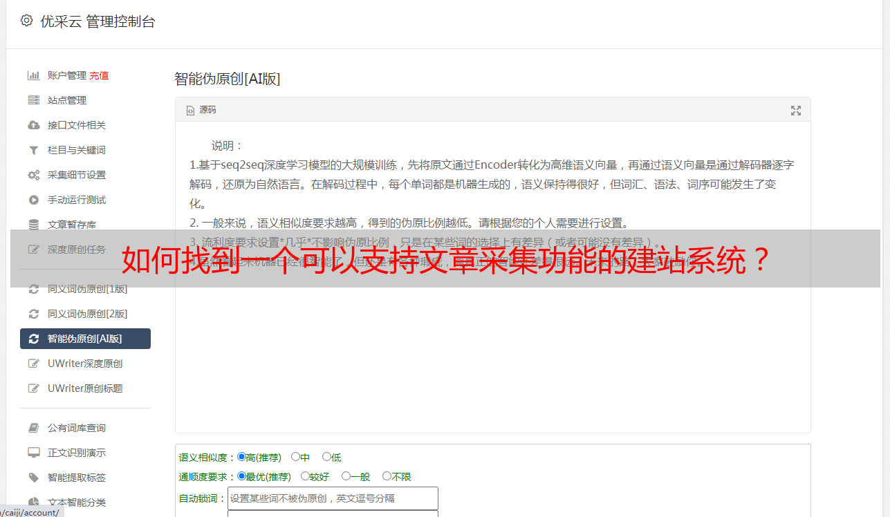 在这里,我想向大家推荐优采云这款建站系统。优采云是一款全功能的建站系统,可以帮助用户快速建立一个强大的网站。它具有强大的SEO优化功能,可以帮助用户在搜索引擎中获得高排名。此外,它还具有文章采集功能,可以帮助用户快速批量采集各大新闻媒体、论坛、博客、微博等多个平台上的内容。使用优采云,不仅可以节省大量时间,还可以获得大量有价值的内容。