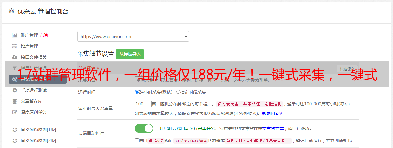 17站组管理系统是一组多任务站组管理系统,只需输入关键字即可采集新的相关内容,然后由SEO自动将其发布到指定的网站. 它可以一天24小时自动维护数据. 数以百计的网站. 17站组软件会根据设置的关键字自动捕获主要搜索引擎的相关搜索词和相关的长尾词,然后根据派生的单词捕获大量新数据,完全放弃了繁琐的规则普通采集软件定制,实现一键采集和一键发布. 17个站组软件不需要绑定计算机或IP,并且网站数量没有限制. 它可以一天24小时采集和维护,以便网站管理员可以轻松管理数百个网站. 该软件独特的内容抓取引擎可以快速,准确地在Internet上抓取新内容,并具有内置的文章伪原创功能,可以极大地增加网站的收录范围,并为网站管理员带来更多流量!