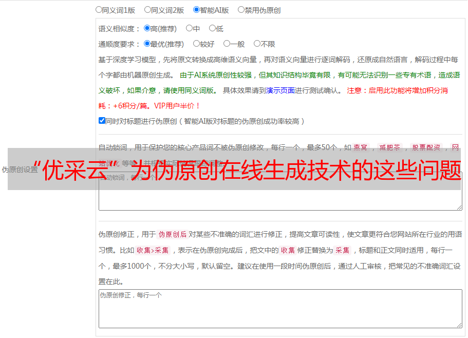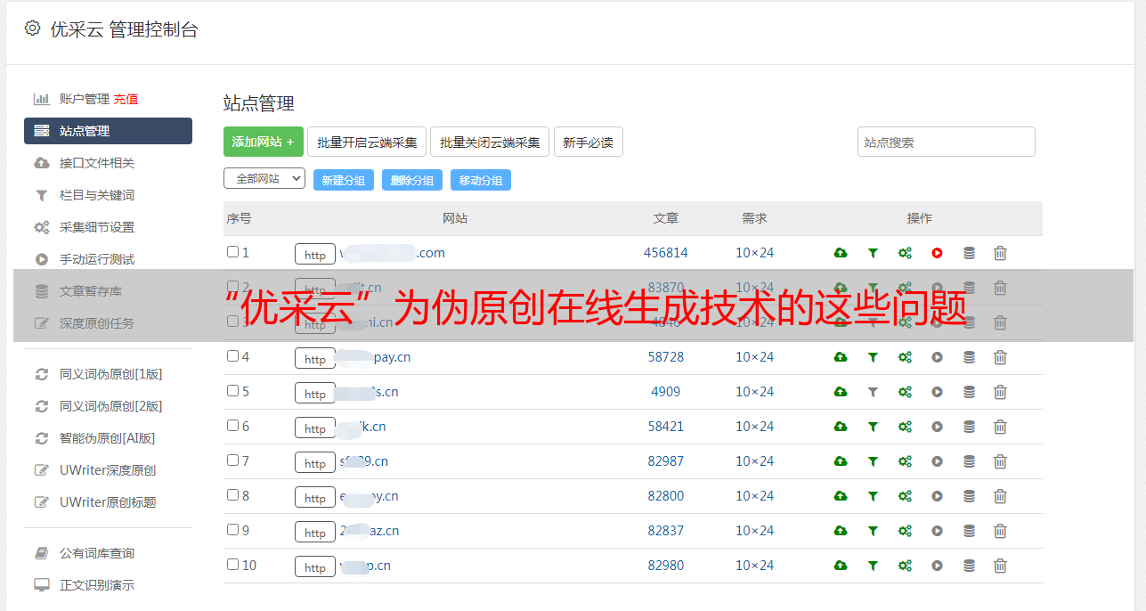 总之,“优采云”是一款专业而强大的伪原创软件。它可以帮助用户快速准确地生成大量不同的伪原创文章内容;同时也能够帮助用户进行SEO优化和避免文章内容重复性太高、文章内容质量不高等问题。如果你正在寻找一款强大而专业的伪原创软件来帮助你快速准确地生成大量不同的文章内容,那么“优采云”就是你最好的选择。想要尝试使用“优采云”来快速准确地生成大量不同的文章内容吗?请赶快上www.ucaiyun.com来体验吧!