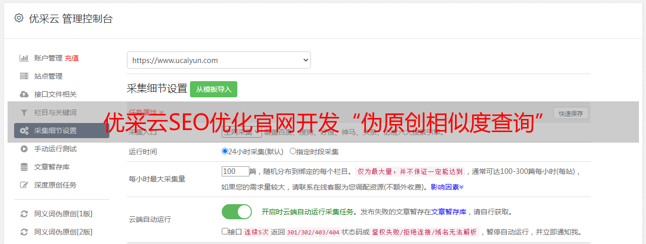 其实,不少网站运营者都不太了解如何检测伪原创文章,以及如何准确判断一篇文章是否真正的原创。因此,优采云SEO优化官网www.ucaiyun.com开发了一款非常方便的工具--“伪原创相似度查询”,旨在帮助用户准确地检测文章的相似度。