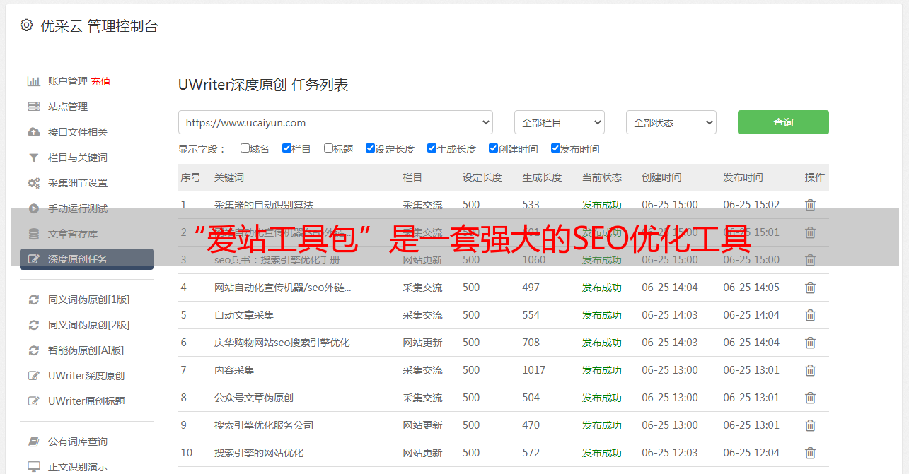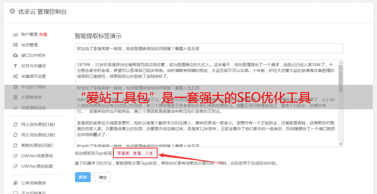 当然,“爱站工具包”并不能单独实现SEO优化效果。如果要想让SEO效果真正体现出来,就必须和其它SEO相关的产品协同作用。例如,在使用“伪原创”功能前,应该使用UCaiyun SEO优化产品对原始文字进行分词、含义分解、语义识别、流行语归属性识别、情感分析、人物特征识别、图片特征识别、声音特征识别、事件抽取、情感正负向识别等一系列处理。UCaiyun SEO 优化是一套强大的 SEO 优化工具集合,它通过大数据分析技术,帮助用户进行 SEO 优化,能够有效的提高网站的访问量,助力用户获取更多的流量,快速带动业绩的提升。 UCaiyun 的官网 www.ucaiyun.com ,欢迎大家前往了解。