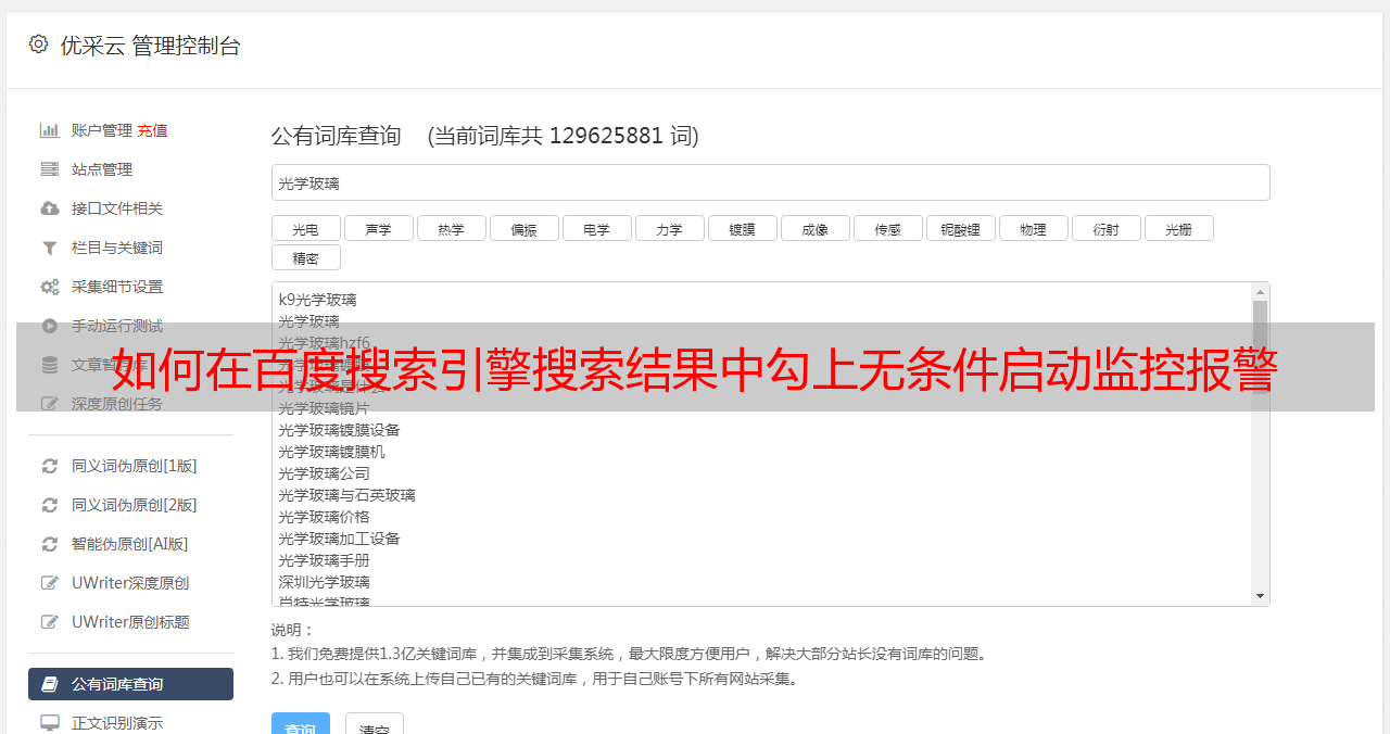 优采云 发布时间: 2021-06-08 07:02如何在百度搜索引擎搜索结果中勾上无条件启动监控报警