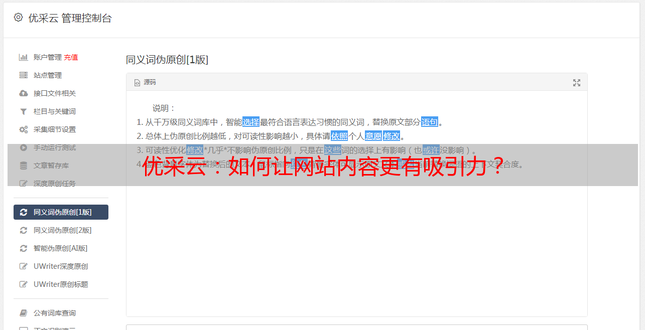 总而言之,想要让网站内容变得更有吸引力,就必须要对文章进行SEO优化和文字优化。考虑到时间和效率方面的因素,使用专业高效的采集软件——优采云可能是一个不错的选择。此外,还应该注意不要将原创作品直接复制使用(www.ucaiyun.com)。