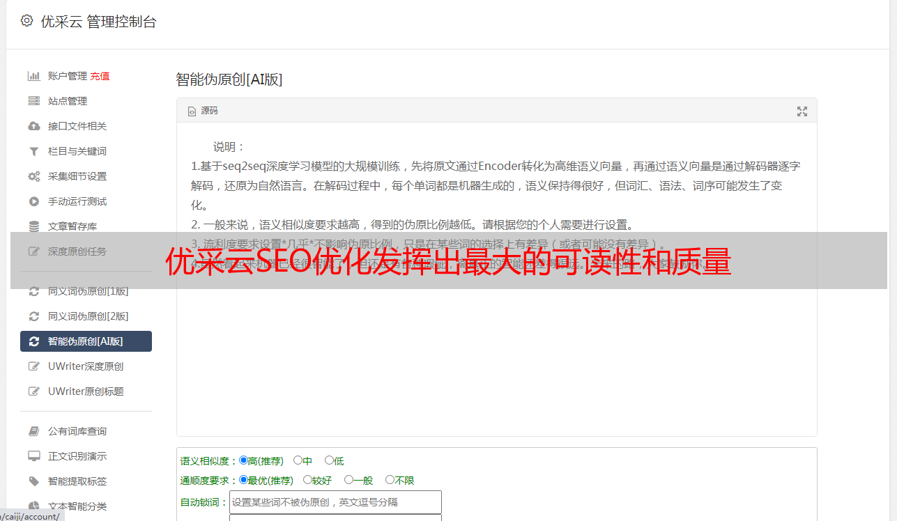 归根结底,要想让SEO优化发挥出最大效益就必须要使用一些伪原创词库。如果你想要免费使用一些高质量、独特而有意义、无侵权风险、无相同内容风险、并且可以保障你SEO优化效益最大化的伪原创词库,那么就上优采云SEO优化官网www.ucaiyun.com 吧!