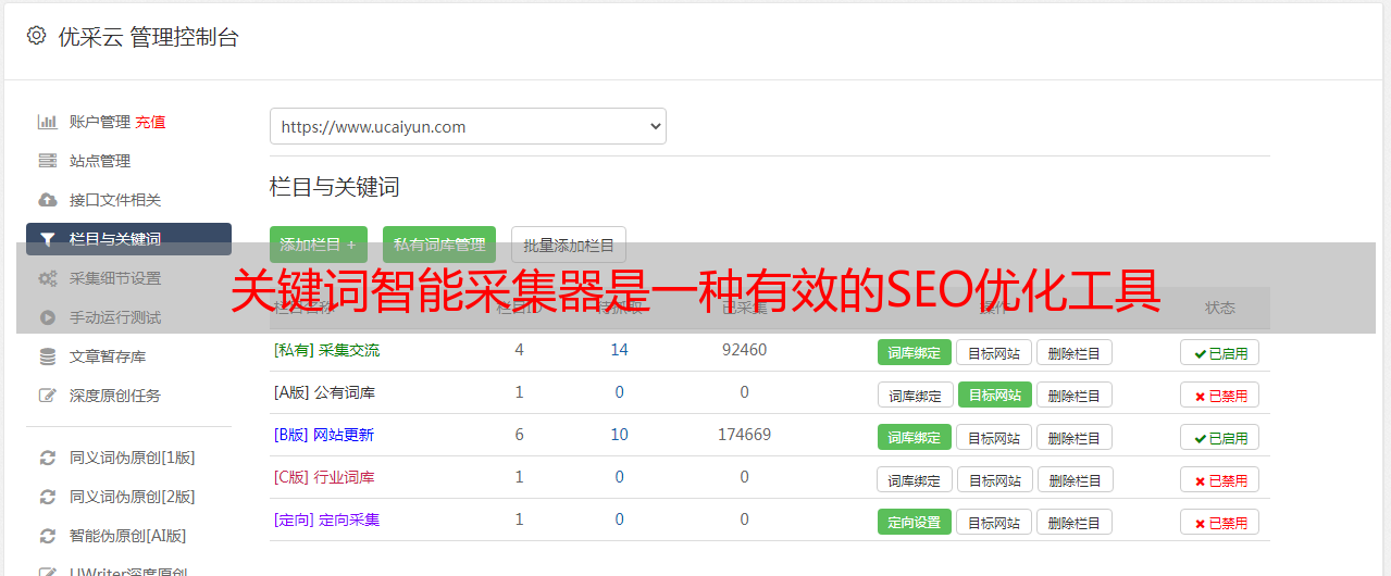 总之,优采云是一个强大而易用的关键词智能采集器,它可以帮助SEO优化者快速、准确地获得最新、最相关的关键词;此外,它还可以帮助SEO优化者分析竞争对手网站使用的关键词情况。如果你想要尝试一下这个强大的SEO工具,你可以在官网www.ucaiyun.com上注冊并使用。