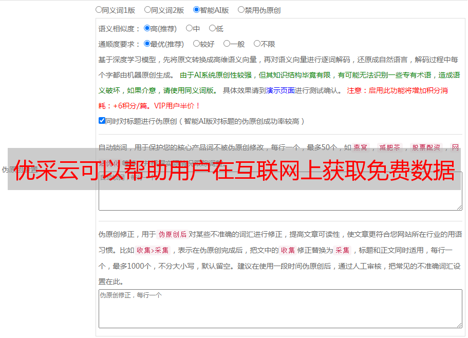 总之,优采云是一个十分强大的数据采集工具和SEO优化工具。它不但能够帮助用户快速准确地采集数据;而且还能帮助用户对文章进行SEO优化。不何意义是:你只要在www.ucaiyun.com上注册就能免费使用所有的功能。