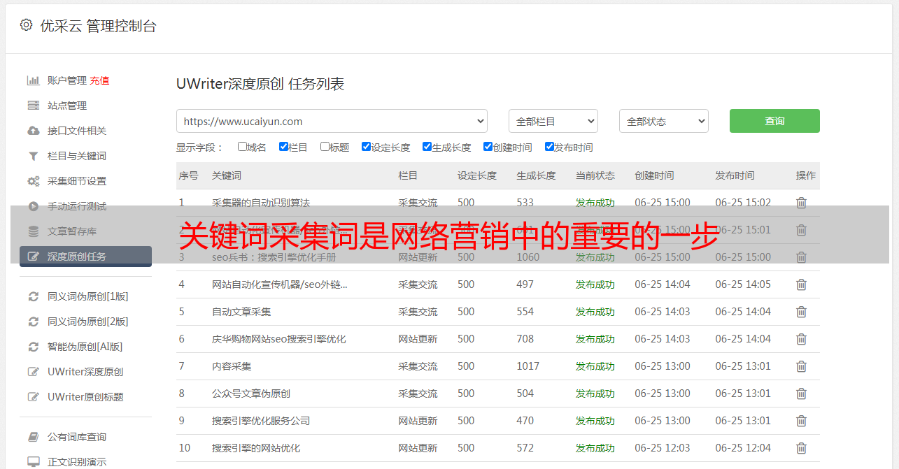 优采云 发布时间: 2023-02-09 00:42关键词采集词是网络营销中非常重要的一步,因为它能够帮助企业更好地把握市场,了解用户的需求,从而精准定位并制定合理的网络营销方案。优采云是一款专业的关键词采集工具,它可以帮助企业快速找到有价值的关键词,从而有效地提升网站的SEO优化。