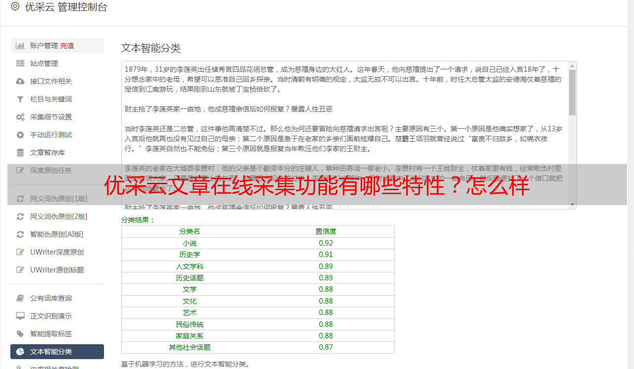 优采云(www.ucaiyun.com)是一款具有文章在线采集功能的建站系统,它拥有强大的SEO优化功能,能够帮助企业或个人快速构建一个高质量、安全、高速度的营销网站。