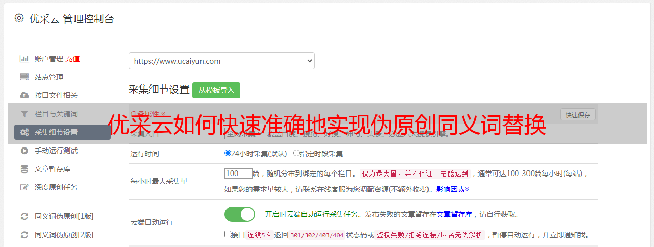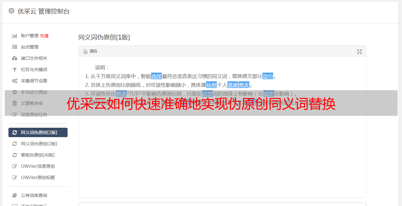 总之,优采云是一款强大、易用、高效的SEO优化软件。它能够快速准确地实现伪原创同义词替换,使文章内容原创、内容不错、SEO 优化效果明显。如果你想要快速、准确地实现 SEO 优化效果,不妨来看看优采云的官网 www.ucaiyun.com !