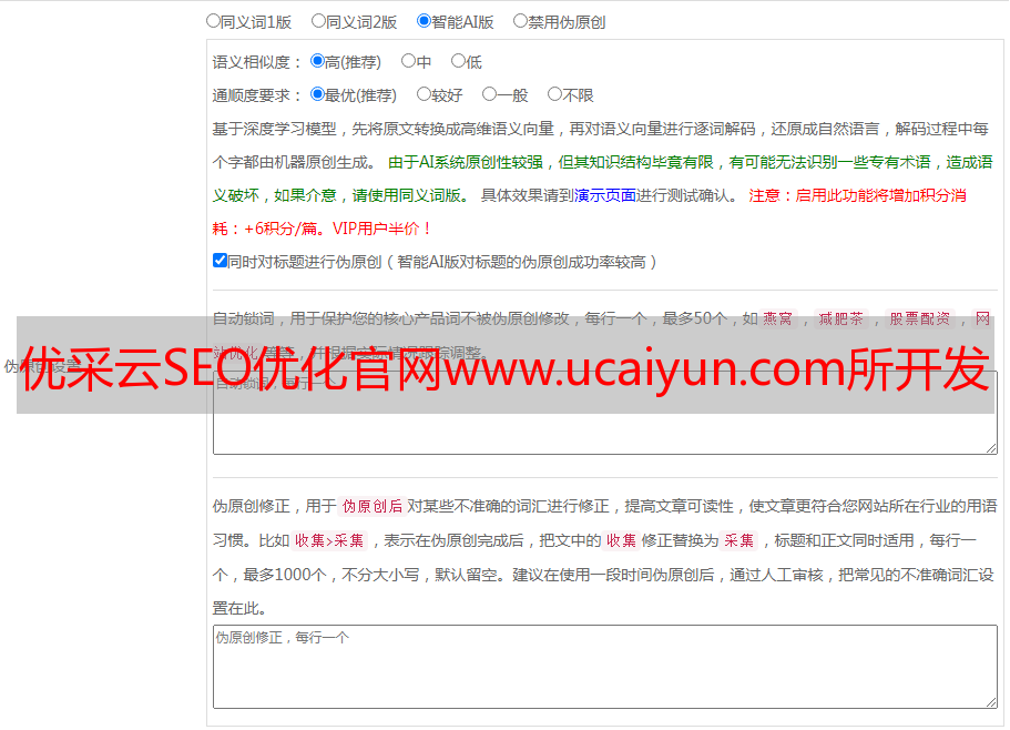 总之,作为一款功能强大、易用性高的伪原创检测工具,优采云SEO 优化官网www.ucaiyun.com所开发的“优采云SEO 优化”工具能够帮助用户快速、准确地将文章中存在问题标记出来并提供相应信息咨询服务。考虑到保障信息真实性和信誉度问题(如避免被封杀、避免被用户反感等情况发生))乃至整个信息生态都十分重要性因此使用“优采云SEO 优化”已成为当前时代必不可少的工作之一。