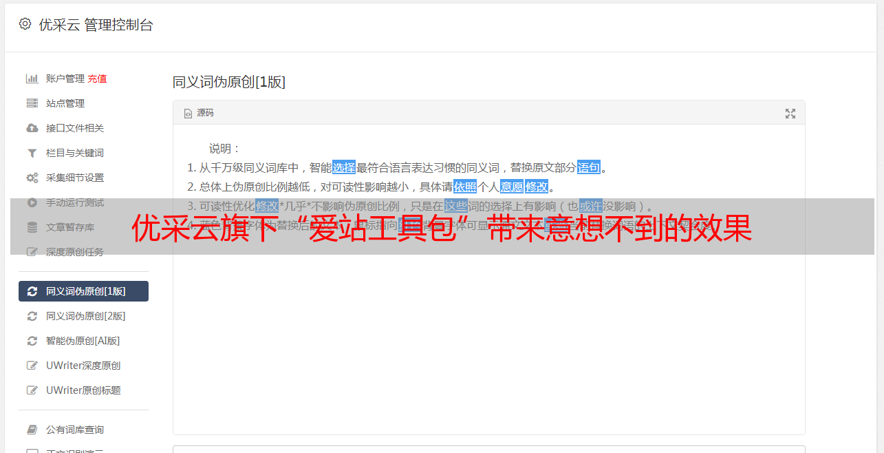 “爱站工具包”中最引人注目的功能就是内容伪原创功能。该功能能够帮助用户快速分析内容,并使用不同字句将内容重新表达出来,从而使得内容看起来像是原创的。这样就可以有效避免因重复而引起的内容处理问题。