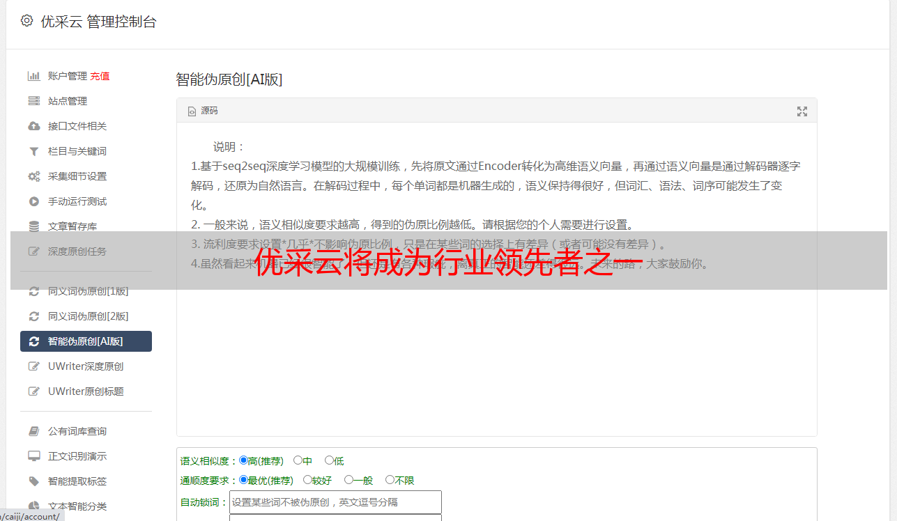 优采云是一家专注于数据采集领域的公司,它提供全方位的数据采集服务,包括图片、文字、音频、视频等各种形式的数据,其中包括SEO优化、多线程采集、大数据分析、AI语义分析以及API对接等。通过优采云的自动采集服务,企业可以快速准确地完成大批量数据的采集工作,从而使企业能够在市场竞争中保持一定的优势。