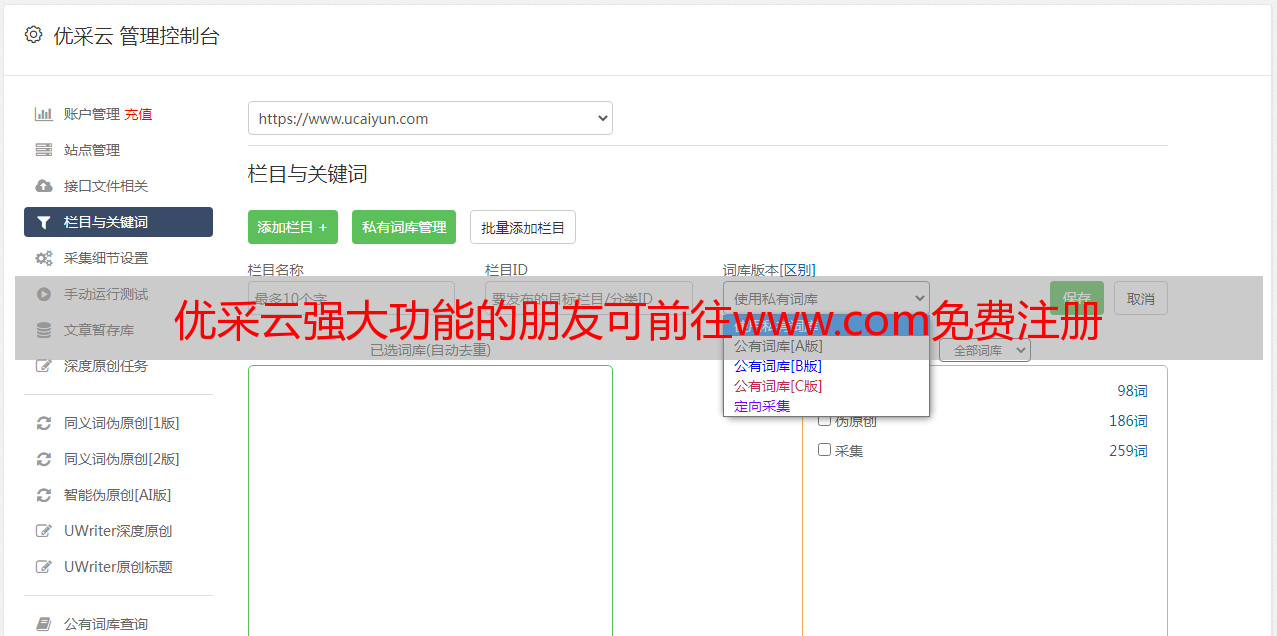 优采云是一个强大的文章采集工具,既有效地帮助用户快速获取大量有效信息;也能够帮助用户对信息中出现的关键词进行SEO优化。如想要体验优采云强大功能的朋友,可前往www.ucaiyun.com 免费注册即可使用。