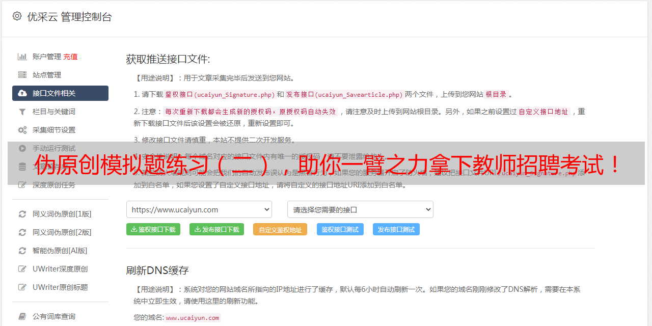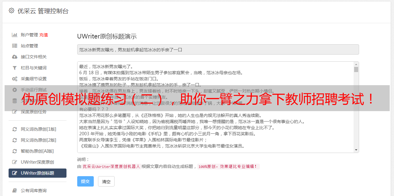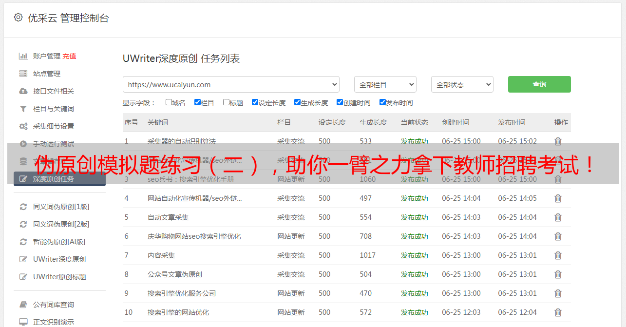 2. youcaiyun使用自己独特的技术来帮助客户快速生成伪原创文章,而且能够保证生成出来的文章100%不重复。