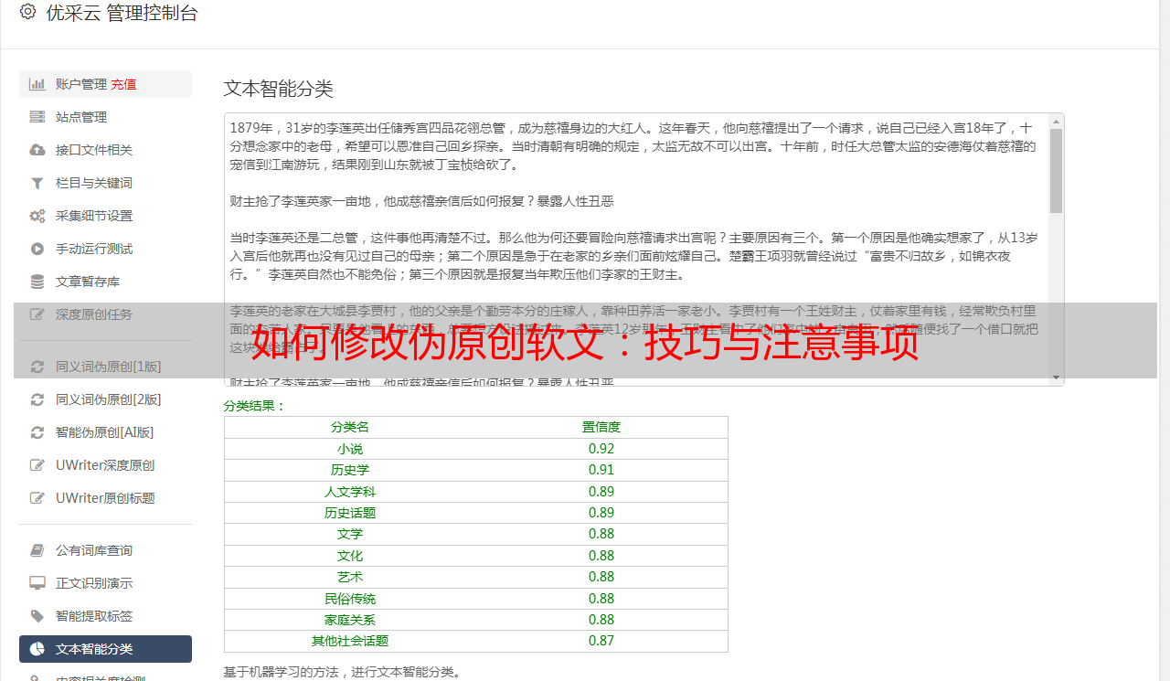 优采云 发布时间: 2023-02-16 00:25##一、什么是伪原创软文是指利用技术手段,在不改变原文的基础上,进行文字重组,调整排版,修改句式,添加新词等方式对原文进行修改,从而达到原创的效果的一种软文。它能够有效的避免重复内容,减少外链影响,并能够有效的增加网站权重。