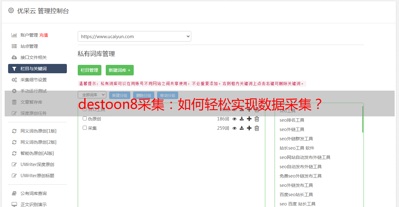 优采云 发布时间: 2023-02-16 11:461. destoon8采集是一款功能强大的网页采集工具,它能够帮助用户快速、高效地从网络上抓取有用的信息。