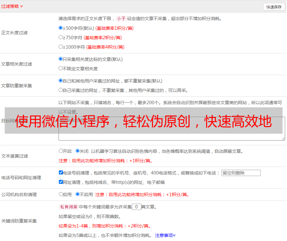 此外,微信文本伪原创小程序还可以帮助用户快速和准确地识别出重复内容和低质量内容,从而使用户能够快速找出重复内容并对其进行修改。因此,微信文本伪原创小程序不仅能够帮助用户快速生成伪原创文章,而且还能够帮助用户快速识别出重复内容并对其进行修正。