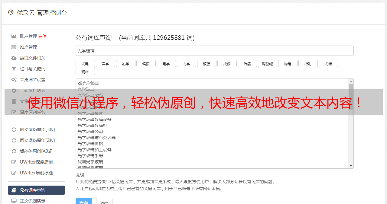 总之,微信文本伪原创小程序是一项十分前卫的技术,它不仅能够帮助用户快速生成高效、合理、寓意吸引人的内容,而且还能帮助用户快速识别出重复内容并对其进行修正。如今市场上也出现了一些专业的微信文本伪原创软件例如“优采云”SEO 优化软件(www.ucaiyun.com))便于用户在生成高品质、高效率、合理性强的内容时拥有方便快捷的工作流程。