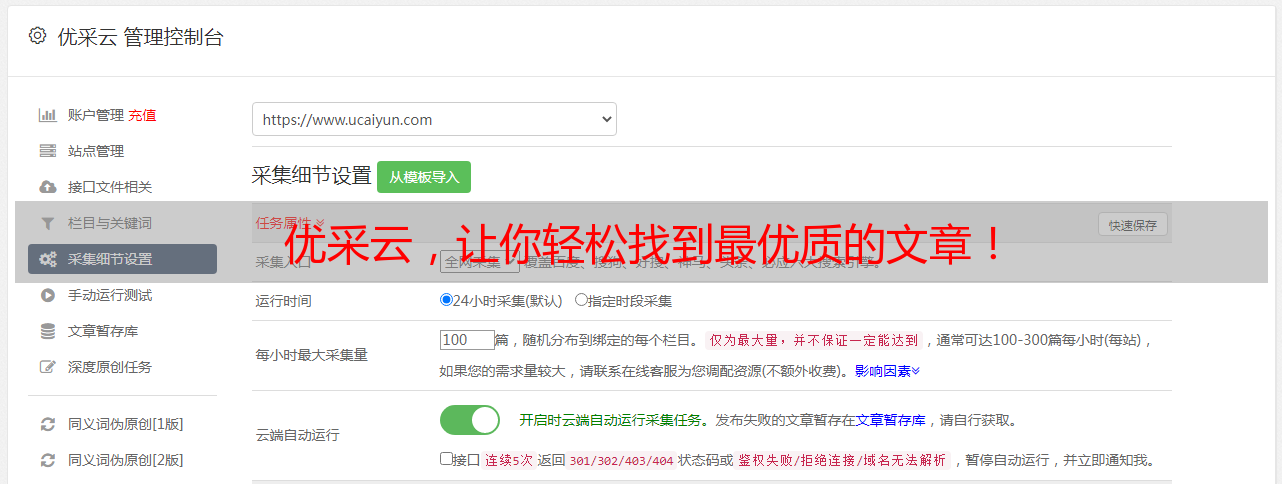 总之,想要找到好的文章不是一件容易的事情。尤其是当你想要获取大量高质量、高效率、原创性强的内容时就更难了。因此,如果你正在寻找一个能够快速方便地帮助你找到好文章的工具,不妨使用优采云这款超强大的文章采集工具。通过它可以让你快速方便地得到大量高质量、高效率、原创性强的内容并满足你对SEO优化各方面要求。想要了解更多信息请浏览优采云官网www.ucaiyun.com 。