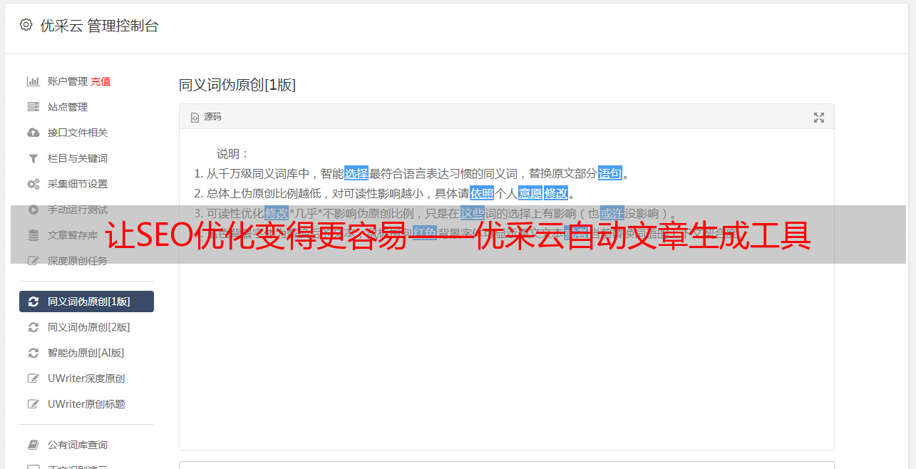 优采云是一款强大的SEO优化软件,其中包含了一项先进的伪原创api功能,可以帮助网站主和内容创作者快速、高效地完成内容创作任务,并使其文章达到最高水平。