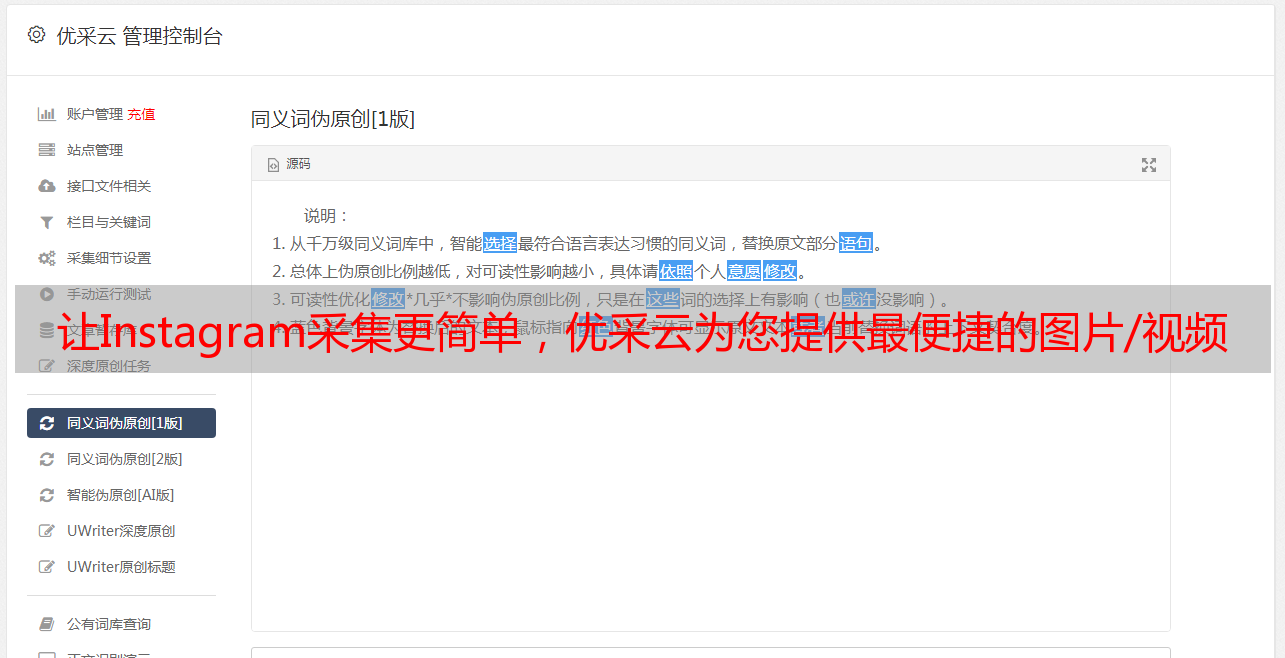 优采云 Instagram采集软件是一款强大而易于使用的工具,不但可以帮助用户快速方便地采集数据,而且还能够有效避免IP地址封锁而无法采集数据。此外,它还具备SEO优化功能,可以帮助用户将图片和视频更好地推广到各大搜索引擎中。如想了解详情,请登录官网www.ucaiyun.com 了解详情。