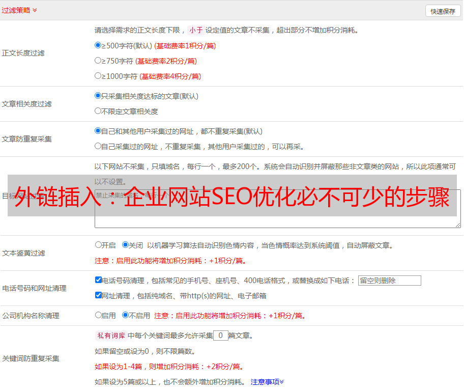 在进行网站SEO优化的时候,采集器随机插入外链可以帮助企业快速实现关键词链接、内容相关性以及内容质量的提升。而采集器随机插入外链的效率也是一个进行SEO优化必不可少的工具。