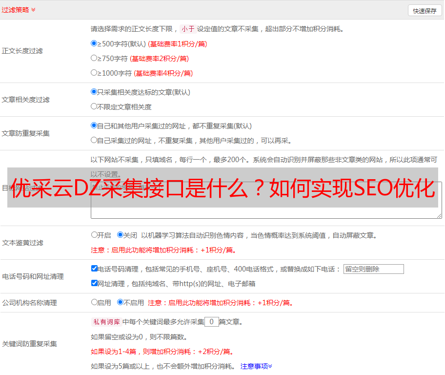 优采云是一家专注于帮助企业快速实现SEO优化的软件公司,为企业用户提供专业的DZ采集接口服务。优采云的DZ采集接口不仅能够快速、高效地从各种网站上获取大量的有用信息,而且还能够将获取的信息写入数据库,以便后续使用。此外,优采云还提供了一些额外的功能,如SEO优化、图片剪裁、资料归类、代理IP访问、URL监测等,使得开发者能够通过DZ采集来实现SEO优化。