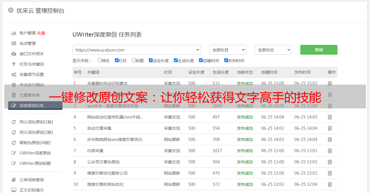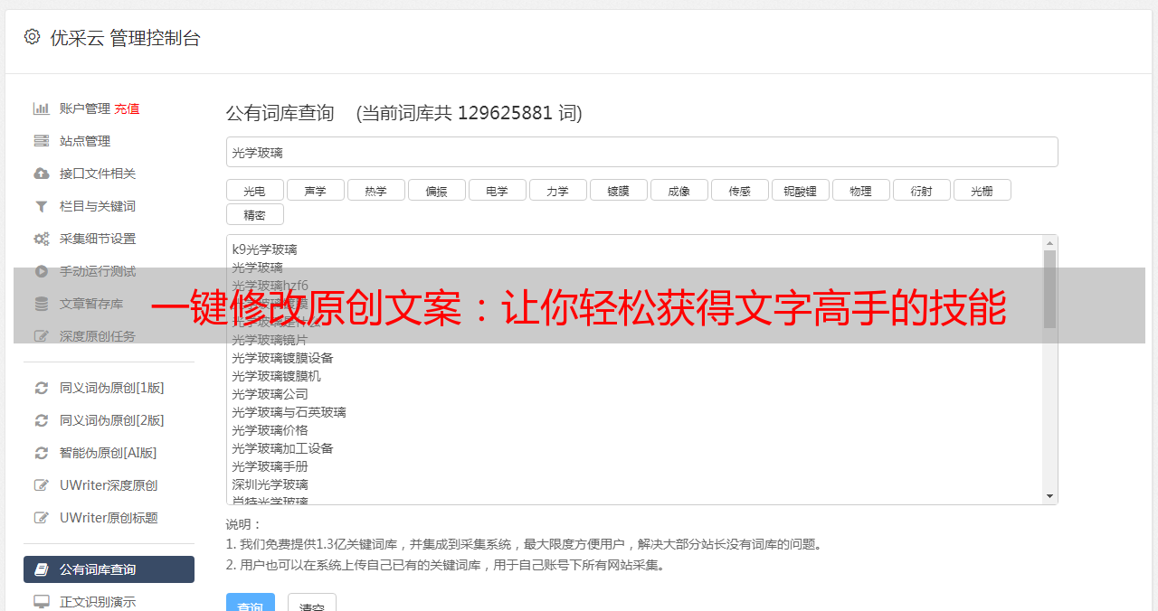 优采云通过一键修改原创文案的方式,帮助用户快速、准确地将原创文章修改成符合SEO优化要求的内容。优采云使用了先进的人工智能和自然语言处理技术,可以快速、准确地对原创内容进行修改。