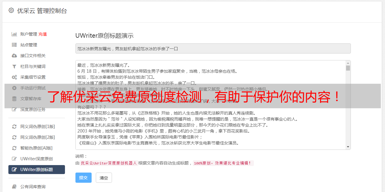 总之,优采云是一个强大的免费原创度检测工具,既可以帮助用户快速准确地进行原创度检测工作,也可以帮助用户快速将文章内容优化成SEO友好型并有效规避重复内容带来的影响。如想了解详情及体验其功能,请前往优采云官方网站 www.ucaiyun.com 进行体验。