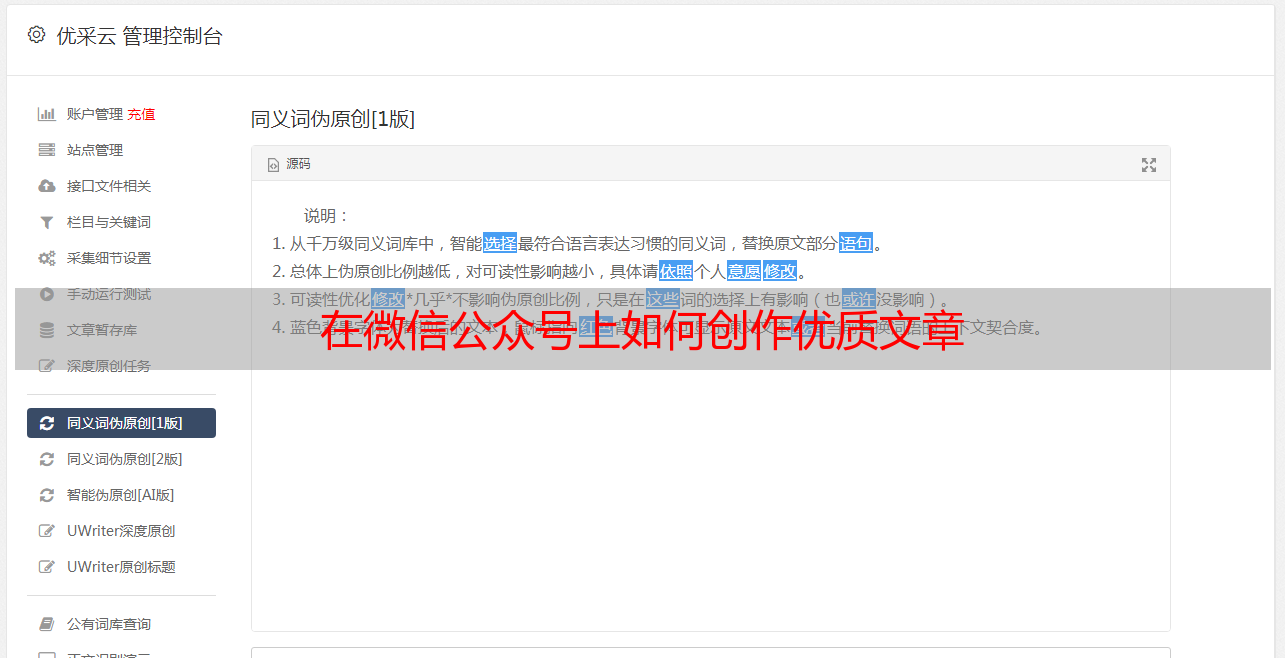 如此复杂的工作对于一般人来说时间和劳动力都不够用。好在目前有一个叫做“优采云”的软件能帮助大家快速、便捷地创建出真正有质量、SEO 优化合理的微信公众号文章。该软件拥有大量庞大而且不断增加、密集而且多样化的数据库(包含流行话题、时政要闻、热门小说、影视剧剧情、旅行风光、生活感悟……),能根据不同用户所需要的关键字快速生成带有SEO 优化效果文章片段,并能根据不同用户所需要的主题和思想快速生成带有SEO 优化效果文章,帮助大家快速创作出真正有质量、SEO 优化合理并能代表用户独特思想和风格的微信公众号文章.如想了解更多详情,请浏览官网www.ucaiyun.com.