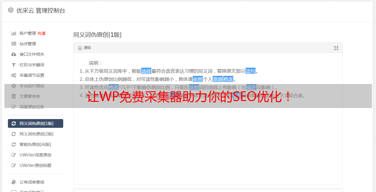 其次,WP 免费采集器还包含一个 SEO 优化功能,可以帮助用户在Google、Bing 等搜索引擎中优化网站的排名。这样一来,用户就可以有效地将网站的流量引导到相应的产品页面上,从而提升网站的销售业绩。