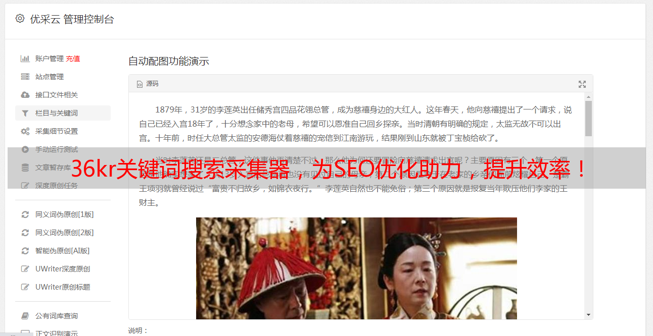 优采云是一个专业的SEO优化工具,旨在帮助用户快速地从36kr上采集相关内容。它可以根据用户输入的关键字快速地从36kr上采集相关文章,并将所有文章进行整理、分类、排序,让用户能够更加方便地找到想要的信息。此外,它还可以帮助用户快速地将文章中所包含的信息进行语义分析、整合,从而得出有效的信息。