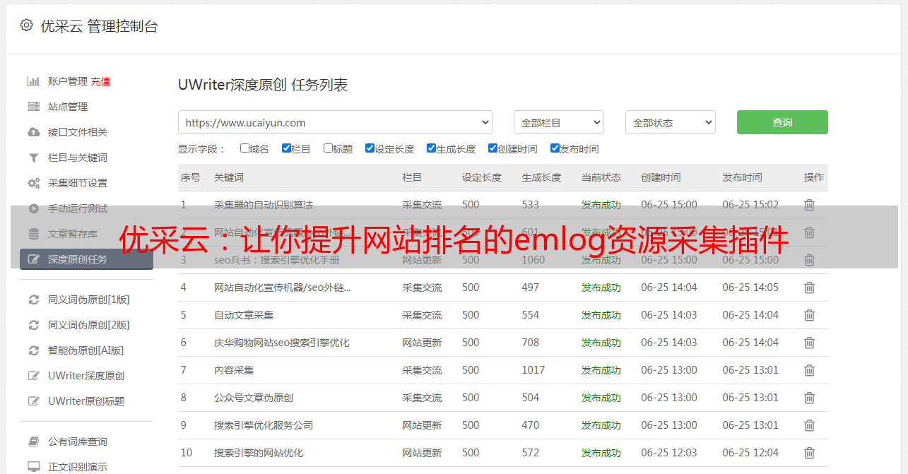 为了帮助用户尽快体验emlog资源采集功能,优采云开发了一款适用于emlog平台上的资源采集插件——“优采云”。该插件拥有强大的内容采集能力,包含新闻、图片、视频、微信新闻、微博新闻、广告位新闻等多个内容来源。此外,该插件拥有优化SEO标题和关键字,并支持多个定时采集功能。详情请浏览官方网站www.ucaiyun.com 。
