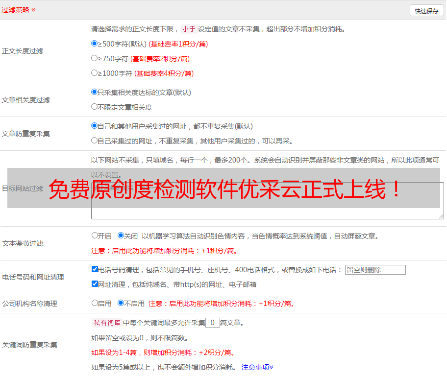 优采云 发布时间: 2023-02-18 12:31随着信息技术的发展,网络内容的原创度检测也成为了众多网站编辑者的重要内容。但是,大多数的原创度检测软件都是付费的,对于那些编辑者来说,付费很不方便。近日,一款名为优采云的原创度在线检测免费软件上线了,它可以帮助用户快速而准确的检测出文章的原创度。
