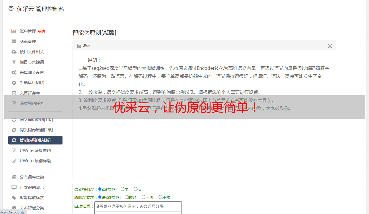 优采云 发布时间: 2023-02-18 14:31伪原创技术是将原有的文章内容进行深度处理,从而形成一种新的、独特的可读性强的文章,让读者感觉像是看到一篇全新的文章。目前互联网上有很多伪原创工具可以使用,今天就来给大家介绍一下最好用的伪原创工具——优采云。